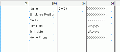- Adjust the space between fields in the DT panel, move the Hire Date, Birth Date, and Home Phone name labels from the BPH panel to the DT panel and place them above their fields.
