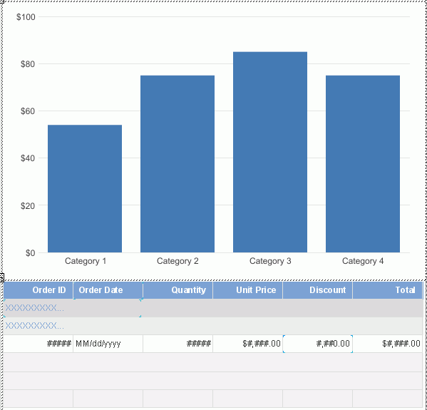 - Select the Unit Price and Total DBFields in the detail row and edit their Format property to $#,###.00.