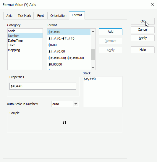 - In the Format Value (Y) Axis dialog box, go to the Format tab, select Number in the Category box, select $#,##0 in the Format box, then select Add to add the format to the Stack box. Select OK to exit the dialog box.